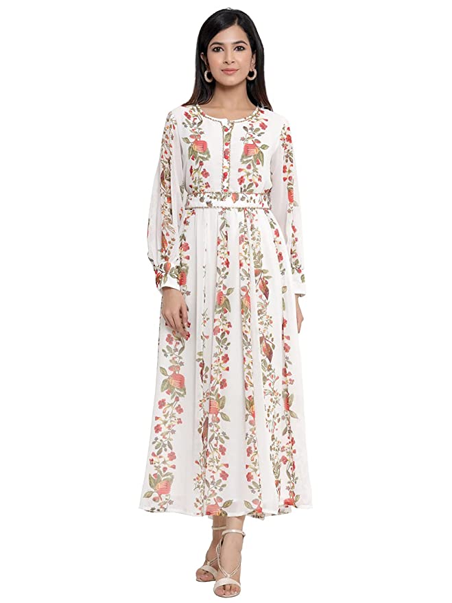 EthnicJuniper Offwhite Chiffon Printed Flared Dress with Waist Tie-up