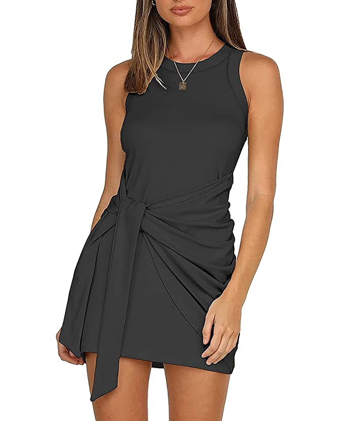LIYOHON Women’s Summer Casual Beach Dress Sleeveless Ruched Tie Tank Bodycon Wrap Mini Dresses