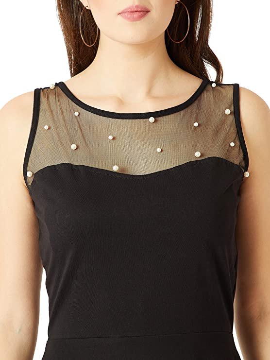Miss Chase Women’s Black Round Neck Sleeveless Cotton Solid Sheer and Pearl Detailing Mini Skater Dress