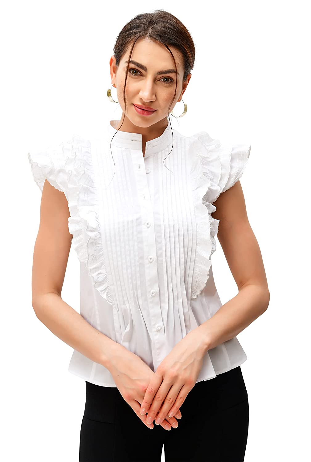 Banded collar. , Ruffle cap sleeves, scallop trim. , Above the hip length. , Front self-button closure. , Inner shoulder bra strap keeps. , 98% cotton/2% spandex, woven poplin, pre-shrunk, smooth finish, wrinkle-resistant, light stretch, midweight. , Machine wash cold. , Model is wearing our size S/4, cut for her height of 5’10”.